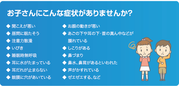 耳鼻咽喉科の外来は約3割から4割が小児であるとも言われています。先天性難聴、中耳炎、鼻閉や鼻水などの鼻炎、のどの痛みなどのかぜ、めまい、いびき、ことばや発達の問題などがありましたらご相談ください。小児科医やST(言語聴覚士)と連携してまいります。 特に先天性難聴については、産科で行う新生児聴覚スクリーニングで要再検査となった新生児の精密検査から確定診断などを行っています。また、専門外来としてサイトメガロウイルス外来(第4水曜午後)という外来を小児科医と行っています。